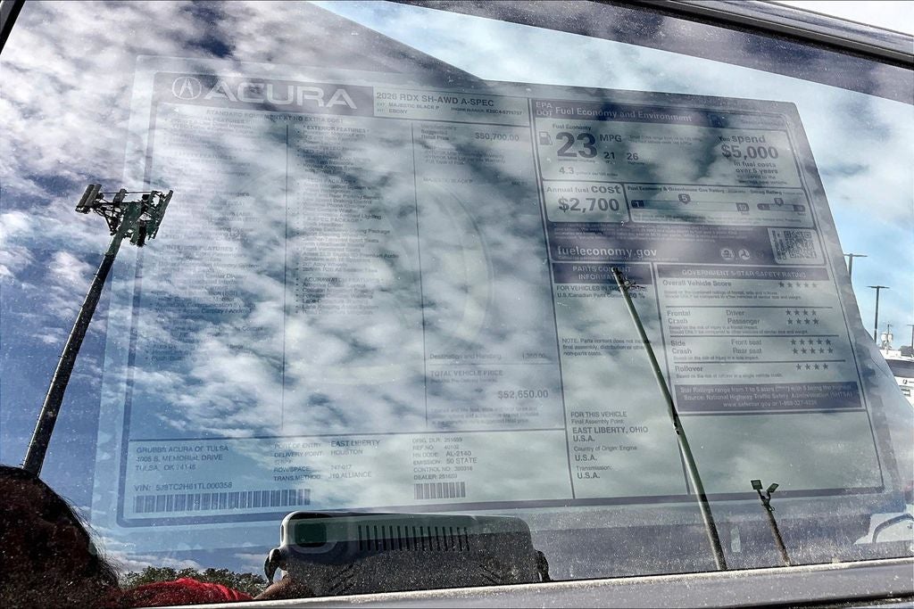 AWD, 16 Speakers, 4-Wheel Disc Brakes, ABS brakes, Air Conditioning, Alloy wheels, AM/FM radio: SiriusXM, Apple CarPlay/Android Auto, Auto High-beam Headlights, Auto-dimming Rear-View mirror, Automatic temperature control, Brake assist, Bumpers: body-color, Compass, Delay-off headlights, Driver door bin, Driver vanity mirror, Dual front impact airbags, Dual front side impact airbags, Electronic Stability Control, Emergency communication system: AcuraLink, Exterior Parking Camera Rear, Four wheel independent suspension, Front anti-roll bar, Front Bucket Seats, Front Center Armrest, Front dual zone A/C, Front fog lights, Front reading lights, Fully automatic headlights, Garage door transmitter: HomeLink, Heated and Ventilated Front Sport Seats, Heated door mirrors, Heated front seats, Illuminated entry, Knee airbag, Lane departure: Lane Keeping Assist System (LKAS) active, Low tire pressure warning, Memory seat, Navigation system: Acura Navigation System with 3D View, Occupant sensing airbag, Outside temperature display, Overhead airbag, Overhead console, Panic alarm, Passenger door bin, Passenger vanity mirror, Perforated Milano Premium Leather-Trimmed Interior, Power door mirrors, Power driver seat, Power Liftgate, Power moonroof, Power passenger seat, Power steering, Power windows, Radio data system, Radio: ELS Studio 3D Premium Audio System, Rear anti-roll bar, Rear reading lights, Rear seat center armrest, Rear window defroster, Rear window wiper, Remote keyless entry, Security system, Speed control, Speed-sensing steering, Split folding rear seat, Spoiler, Sport steering wheel, Steering wheel mounted audio controls, Tachometer, Telescoping steering wheel, Tilt steering wheel, Traction control, Trip computer, Turn signal indicator mirrors, Variably intermittent wipers, Ventilated front seats, and Wheels: 20 x 8.0J Shark Gray Machine-Finished.
